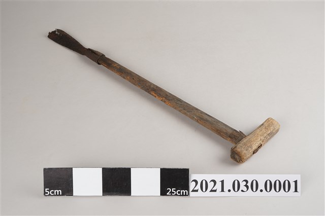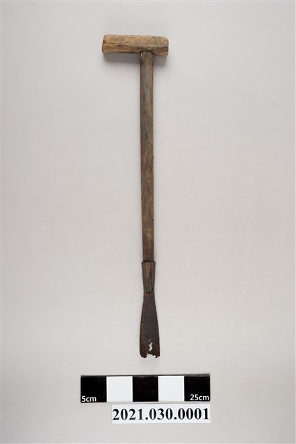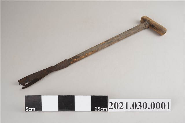 本文物來自台江公親寮,是收成黃麻時農具。本件鑿頭為窄長的弧形刀片,推估前端刀口應為平口刃(物件已鏽蝕)。刀柄長度由農具使用者自行製作,無統一長度。窄長的鑿刀頭便於深入土中,在黃麻左右兩邊深入土中、切斷黃麻根系。日本時代到戰後,台江民眾使用此鑿刀收成黃麻。