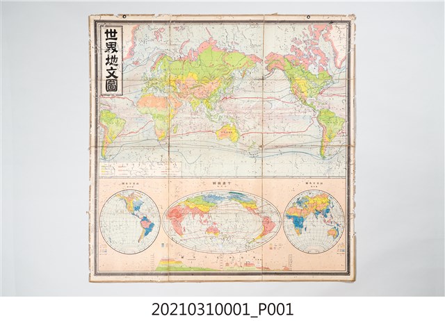 本件為臺南第一高級中學校藏於日本時代臺南第二中學校時期之教學用世界地圖,現存共1套7張地圖,本件為第一版,圖名為世界地文圖,並以全張約1/12折疊形式收存(短邊3折、長邊4折,全攤後可見以折痕分為12區塊)。本件地圖為全彩印刷,正面為地圖、背面疑似以麻布材質裱褙加固,封面由左至右有三張標示貼條,文字由上而下為:一為出版時原地圖資訊標示「第一版/世界地文圖/京都帝國大學教授理學博士小川琢治著」,另有推測應為學校清點時標註資訊:「查」印鑑、「図943」;二為臺南第二中學校管理標籤,資訊標示為「製圖部/名稱:掛圖/第○○○號(資訊已被蟲蛀)/臺南第二中學校」;三為出版社出品標籤圖樣,字樣資訊為「川流堂/T/小林又七」。地圖攤開後可見地圖題名、出版品資訊,地點資訊以日文標示。上半部為世界地理全圖,下半部為等溫線圖與雨量分布圖。本件由地理學家小川琢治著作,發行兼印刷者為川流堂小林又七(日本東京市麴町區隼町四番地,電話四谷二八八六番/五一九六番),定價金六圓。小川琢治為日本1900年代著名的地質學與地理學家,任教於京都帝國大學,為日本人文地理學研究的代表,曾前往日本各地進行地質調查並將研究成果繪製地圖,曾著有《臺灣諸島誌》。本件地圖作為教學用品,補充日本時代所建立的學校體制中,第一線教學現場如何傳遞對於世界與時局的認識。