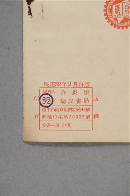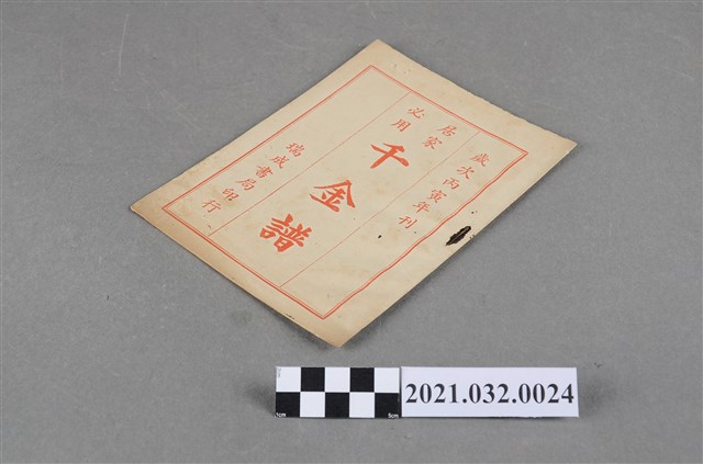 本書為《千金譜》,又名《居家必備千金譜》,釘裝書。《千金譜》曾流傳於閩南、臺灣地區的閩南語啟蒙學書籍,內容多為日常生活事物,可作為識字基礎教材,是良好的家庭教育教材。本書為民國52年(1963)2月由臺中市瑞成書局印行。