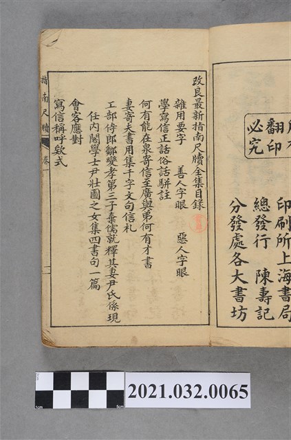 2021.032.0065 黃先登陳壽記書局《改良最新指南尺牘全集》天