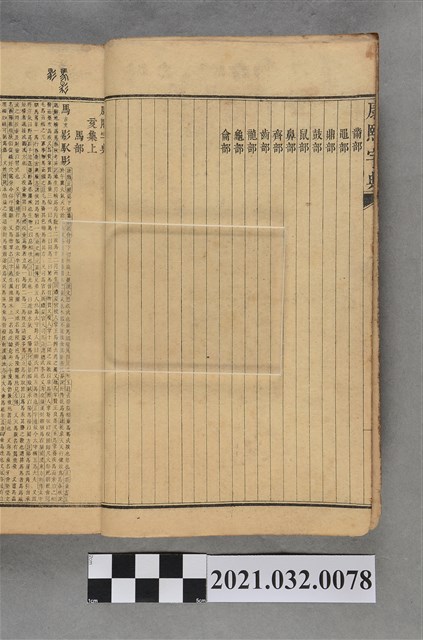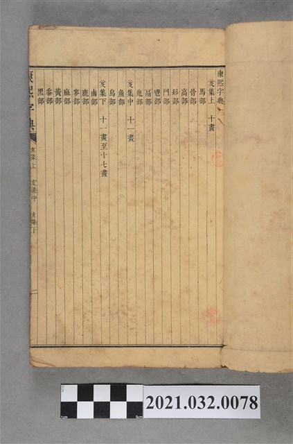 本套書共有6本,皆為線裝書。本書內容為《康熙字典》,分有總目、子集、丑集、寅集、卯集、辰集、 巳集、午集、未集、申集、酉集、戊集、 亥集、備考、補遺,由文華殿大學士兼戶部尚書張玉書及文淵閣大學士兼吏部尚書陳廷敬擔任主編,康熙五十五年(1716)成書。為漢字字典,記錄當時漢語中漢字的點畫寫法、音讀和義訓。本書為光緒丙午年(1906)上海商務印書館石印版本。