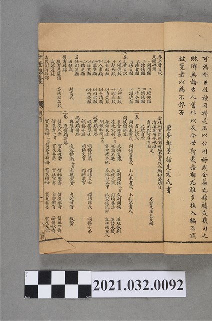 本套書共6本,皆為線裝書。本套書為《酬世錦囊》共分「初集書啟合編」(總目、卷一~卷八)、「二集家禮集成」(卷一~卷七)、「三集應酬寶要」(卷一、卷二)和「四集類聯新編」(卷一、卷二)等四集,為楊克襄著、朱文、熊蔚彬書寫、上元李節齋署名,於光緒庚子年(1900)由上海鍊石齋書局校印。