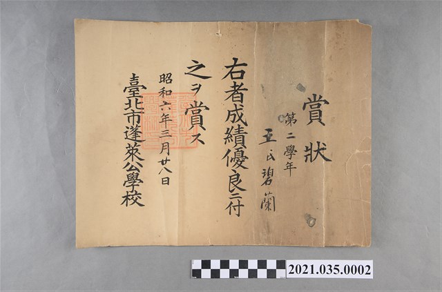 2021.035.0002 王碧蘭臺北市蓬萊公學校第二學年成績優良獎狀