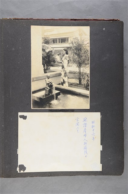 和服女子側身照,照片中女子著和服、綁髮髻,站在水池後方。(照片人物不明)