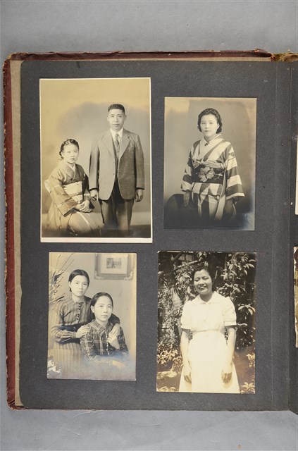 和服女子獨照,照片中女子右手扶著椅背,對著鏡頭微笑。