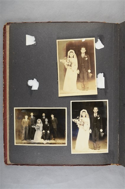 王碧蘭夫妻結婚照,照片中王碧蘭穿西式婚紗,戴頭紗,手持捧花;其丈夫則著西裝,胸口上方別有胸花,戴白手套,左手持捏禮帽。兩人並肩。