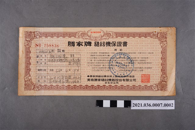 2021.036.0007.0002 勝家牌縫紉機保證書