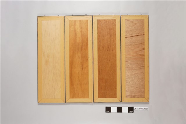 1. 本件刺繡花鳥四條屏共1組4件,為捐贈者1954年結婚時父親為其準備嫁妝之一,購買於台南市區(購買地點與購買金額不詳,捐贈者描述可能是中正路一帶的日本刺繡店),主要懸掛於新房內牆上作為裝飾與祝福之用。四條屏之圖案主要採平繡法,以彩色絲線手工繡製花鳥圖案於米白色的緹花布上,圖案內容皆為成雙成對的中式花鳥吉祥圖案,例如白鶴與松樹、公母雞與梅花、鸚鵡與桃花、雀鳥與牡丹,有松鶴長春、圓滿吉祥、夫妻恩愛、美滿富貴等寓意。刺繡圖案範圍約15.5cm寬,58cm長,繡品完成後再裱褙於紙張上,最外層再裝木框與玻璃,外框尺寸為24.8cm(寬)X 74.5cm(長)X 1.3cm(厚)。由於是嫁妝,每幅條屏上方貼有雙囍字。