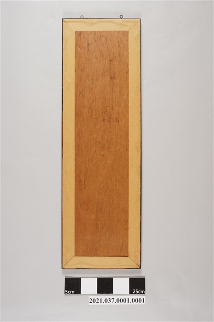 1. 本件為刺繡花鳥四條屏之一「松鶴長春」刺繡條屏,為捐贈者1954年結婚時父親為其準備嫁妝之一,購買於台南市區(購買地點與購買金額不詳,捐贈者描述可能是中正路一帶的日本刺繡店),主要懸掛於新房內牆上作為裝飾與祝福之用。條屏之圖案主要採平繡法,以彩色絲線手工繡製花鳥圖案於米白色的緹花布上,圖案內容為白鶴與松樹,有松鶴長春之吉祥等寓意。刺繡圖案範圍約15.5cm寬,58cm長,繡品完成後再裱褙於紙張上,最外層再裝木框與玻璃,外框尺寸為24.8cm(寬)X 74.5cm(長)X 1.3cm(厚)。由於是嫁妝,條屏上方貼有雙囍字。