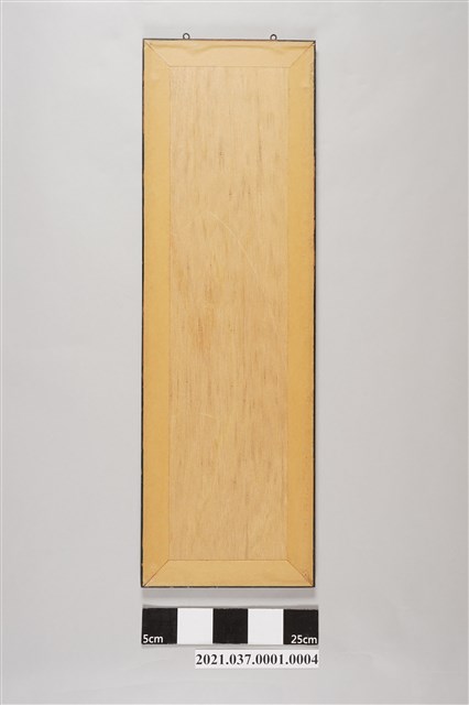 1. 本件刺繡花鳥四條屏之四「美滿富貴」刺繡條屏,為捐贈者1954年結婚時父親為其準備嫁妝之一,購買於台南市區(購買地點與購買金額不詳,捐贈者描述可能是中正路一帶的日本刺繡店),主要懸掛於新房內牆上作為裝飾與祝福之用。條屏之圖案主要採平繡法,以彩色絲線手工繡製花鳥圖案於米白色的緹花布上,圖案內容為雀鳥與牡丹,有美滿富貴之吉祥寓意。刺繡圖案範圍約15.5cm寬,58cm長,繡品完成後再裱褙於紙張上,最外層再裝木框與玻璃,外框尺寸為24.8cm(寬)X 74.5cm(長)X 1.3cm(厚)。由於是嫁妝,每幅條屏上方貼有雙囍字。