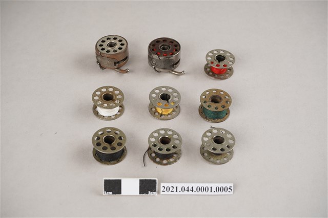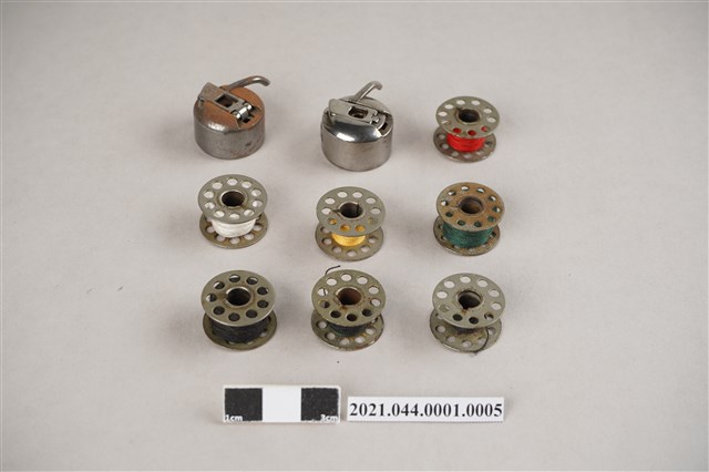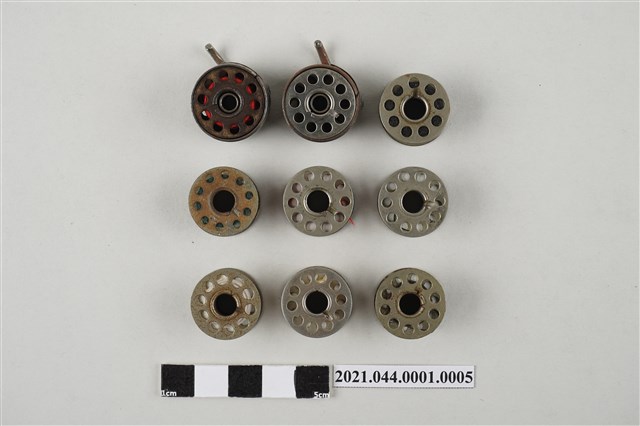 金屬梭子9件與梭殼2件,用於安裝縫線與裁縫之使用。
