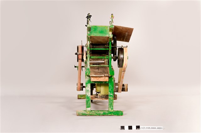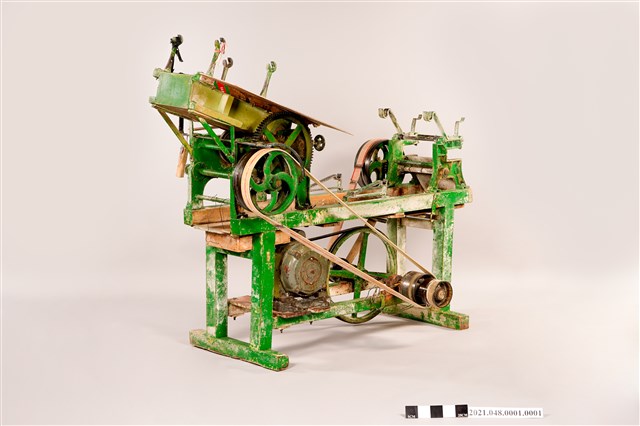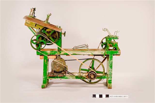 本件為落地型壓麵製麵條機,以木頭支架為主體,外塗綠色漆,支架下方安裝有電動馬達,以皮帶帶動上層的壓麵機與切麵條機。製麵時首先將麵粉與水按所需比例混合好成麵糰,然後將麵糰放入位於較高處的壓麵輪,先壓出薄母帶,然後調整輪間距,繼續將麵糰母帶重複壓成所需的厚薄度,最後捲在卷麵棍上。將捲麵棍上壓好的薄麵帶放到前端的切麵條機上,裝上麵條所需寬度的切割器,將薄麵帶送入機器中切割,切好的麵條會送到前方,在以人工收集麵條成小團,麵條製作即告完成。