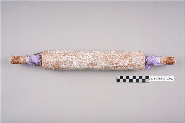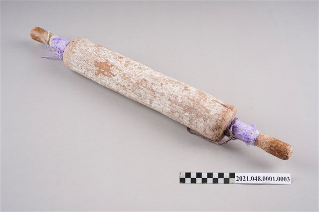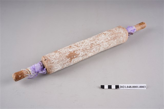 木製卷麵棍,成圓柱狀,中段較粗,左右兩端較細,外型類似手工擀麵棍。主要用架在製麵機上,用來捲壓好的薄麵帶。
