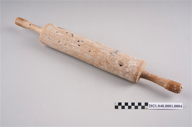 木製卷麵棍,成圓柱狀,中段較粗,左右兩端較細,外型類似手工擀麵棍。主要用架在製麵機上,用來捲壓好的薄麵帶。
