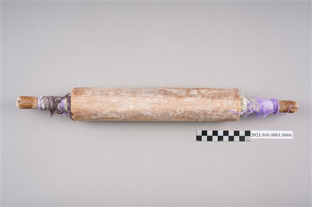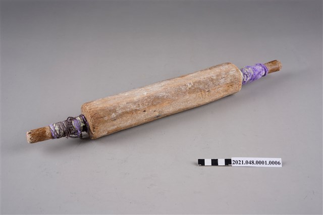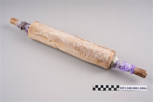 木製卷麵棍,成圓柱狀,中段較粗,左右兩端較細,外型類似手工擀麵棍。主要用架在製麵機上,用來捲壓好的薄麵帶。