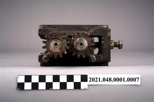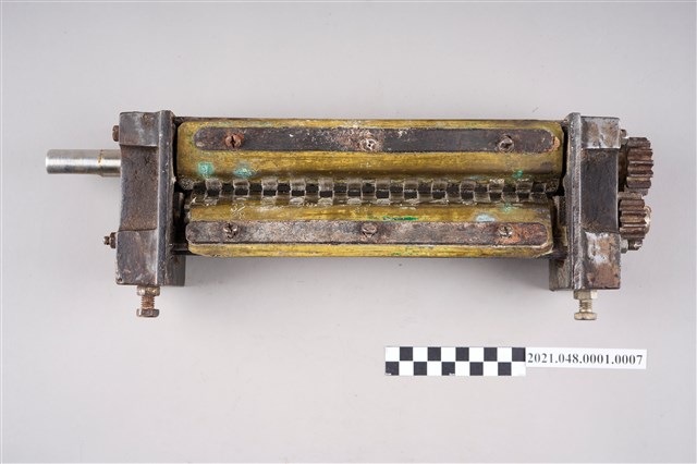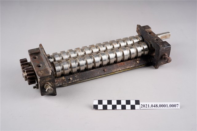 製麵機之金屬麵條切割器,長方形,中下方具有需多溝槽,主要用來切割薄麵帶呈細麵條。