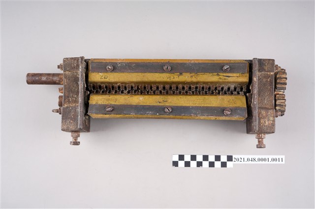 製麵機之金屬麵條切割器,長方形,中下方具有需多溝槽,主要用來切割薄麵帶呈細麵條。