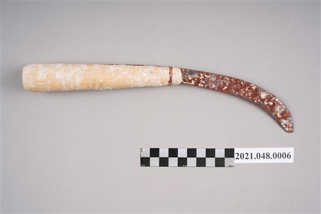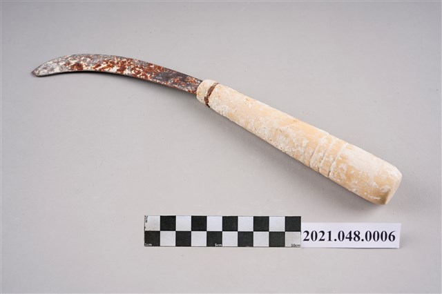 本件為小型鐮刀,刀刃略呈彎曲狀,具有木柄。捐贈者父親製麵時常用來刮除製麵機上卡住軸承、縫隙的小麵糰、粉塊等異物。