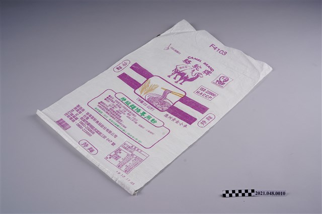 1. 本件為沈家製麵店中所使用的麵粉品牌之一,駱駝牌特級麵條專用粉之外包裝袋,22公斤裝塑膠麻布袋,底色為白色,正面中央印有紫色雙峰駱駝之商標圖案與其他製造標示文字。