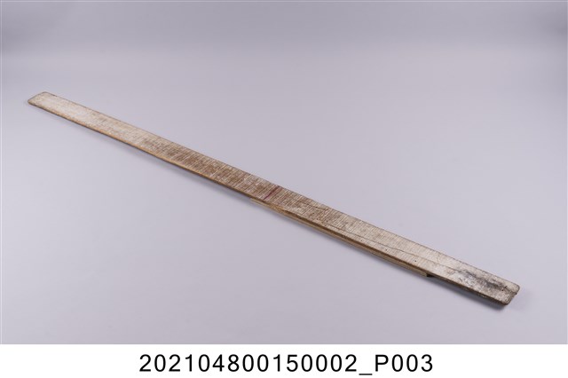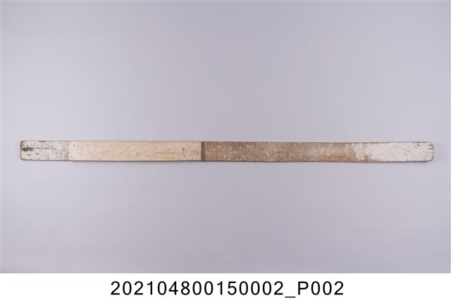 本件為沈父自行製作之細長條木板,長約2公尺,寬約10公分,剛好為餛飩皮所需之寬度。使用時將薄麵帶放置於長尺下方,用切割刀沿著長板的長邊切割出長條狀麵皮,再接著用短竹尺切出正方形的餛飩皮。