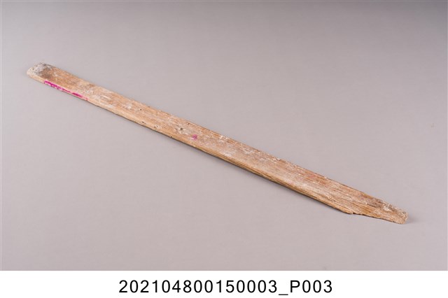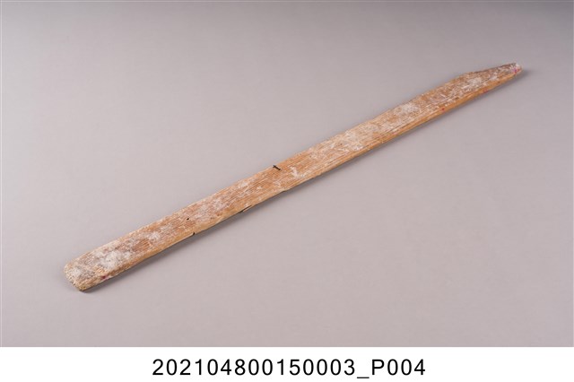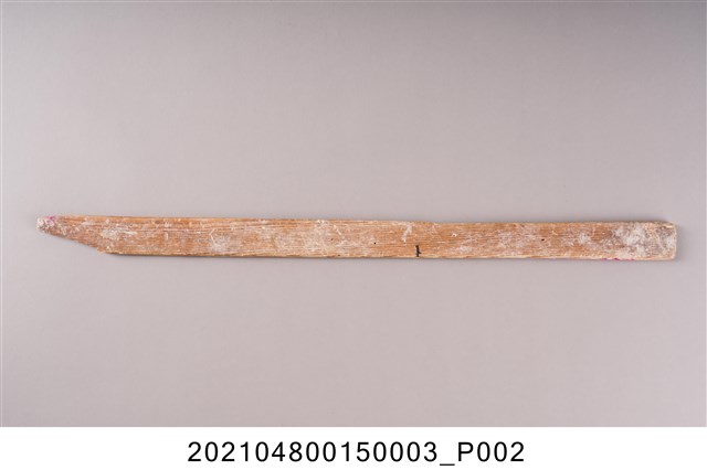 本件為沈父自行製作之細長形短尺,竹製、長約40公分左右,兩端削成尖狀,一長邊筆直,另一長邊略呈弧形。使用時先將薄麵帶放置於長木尺下方,用切割刀沿著長板的長邊切割出長條狀麵皮,再接著用此短竹尺切出正方形的餛飩皮。