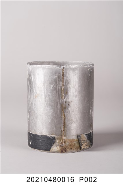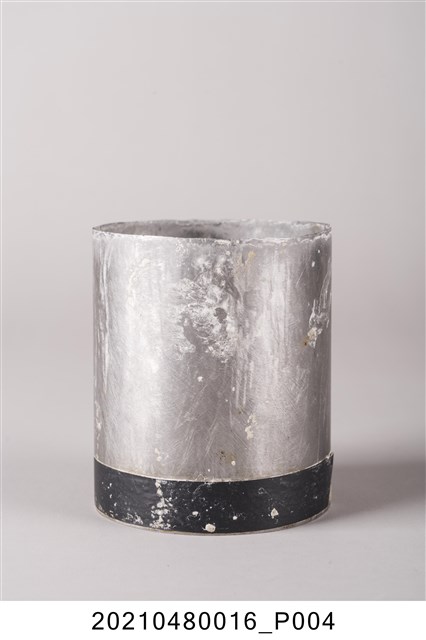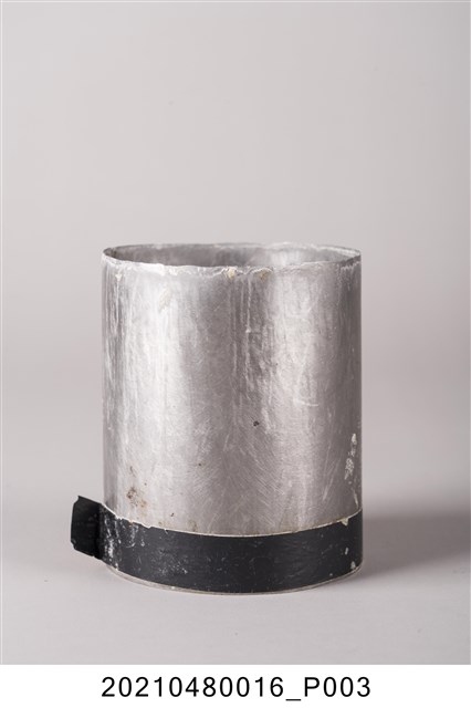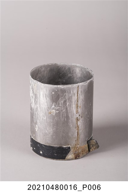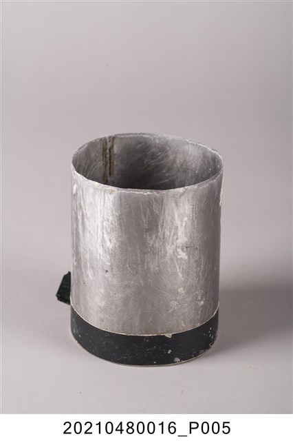 本件為沈父自行製作之水餃皮切割模具,以薄不鏽鋼板捲曲成圓筒狀,交接處略為銲接。較大園的一端為刃部,較小園的一端為柄部,特別用黑膠帶纏繞以示區別。刃部端因經常使用,會反覆重新磨利,使用時必須戴棉手套保護手部,避免壓印時割手,在麵帶上緊密壓印出圓形的水餃皮。