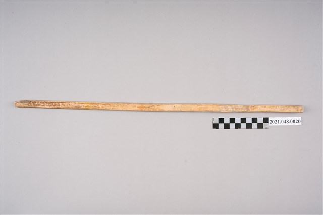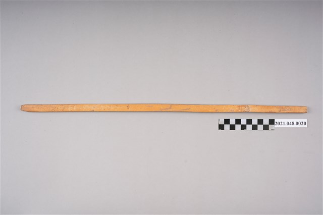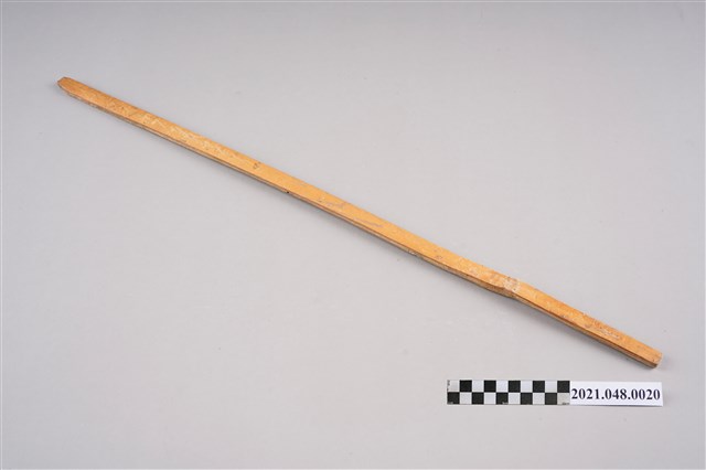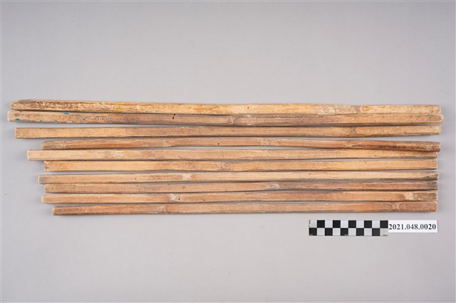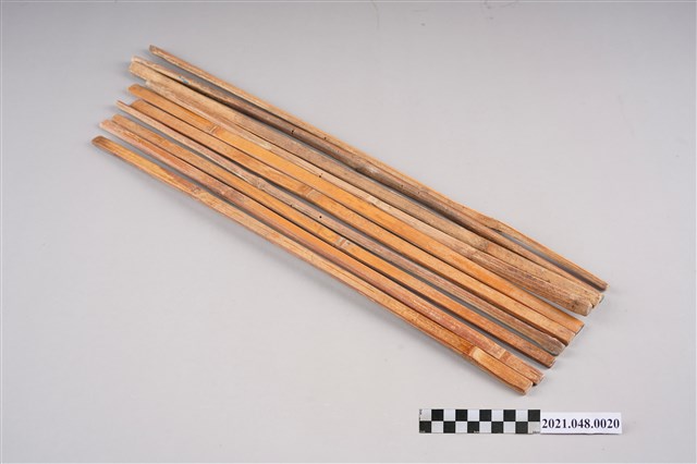 本件為沈家麵店中用來曬乾麵用的短竹桿,由沈父自行製作,共計有10支,長約40公分左右。乾麵製作好之後,將麵條平均鋪掛在竹桿上,讓麵條自然下垂,掛在通風的高處風乾後即可收起來切段與包裝販售。