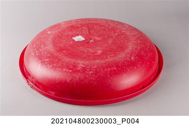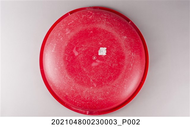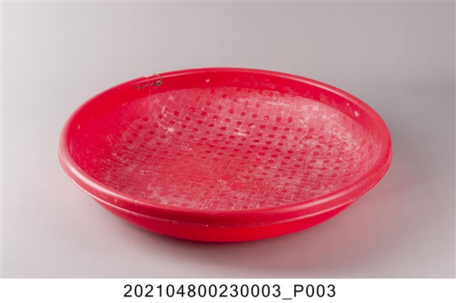 紅色塑膠製成之大淺盤,盤底仿竹籐斜紋編織的紋路,園底。主要用來盛裝做好要賣的麵條、水餃皮、餛飩皮,通常會在盤內撒上太白粉,可避免麵皮類沾黏。
