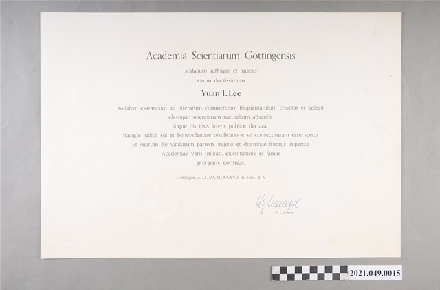 2021.049.0015 李遠哲1988年哥廷根科學院通訊院士證書