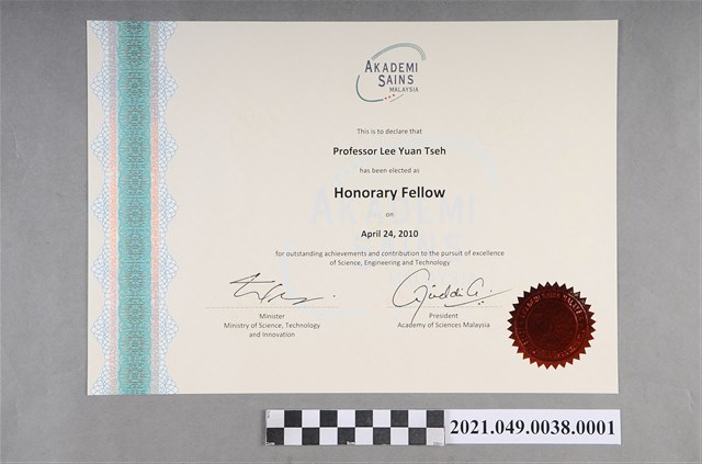 李遠哲2010年馬來西亞科學院榮譽院士證書牌