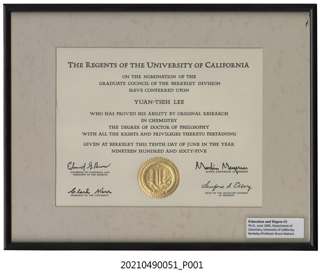 李遠哲1965年加州大學伯克萊分校化學系博士畢業證書