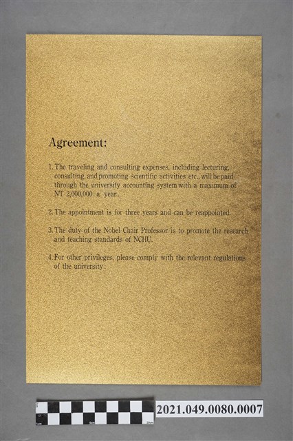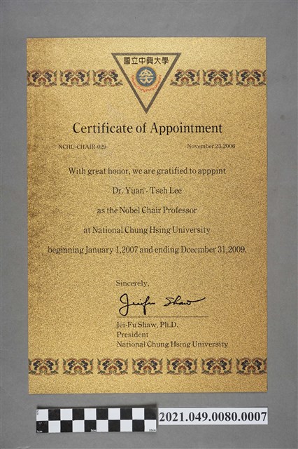 2021.049.0080.0007 李遠哲2006年國立中興大學榮譽講座教授英文聘書