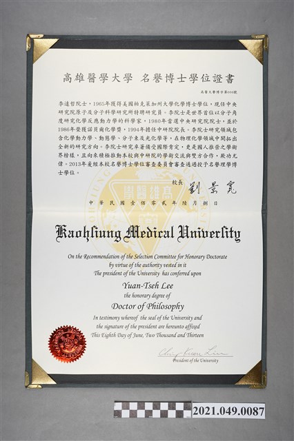 李遠哲2013年國立高雄醫學大學名譽博士證書