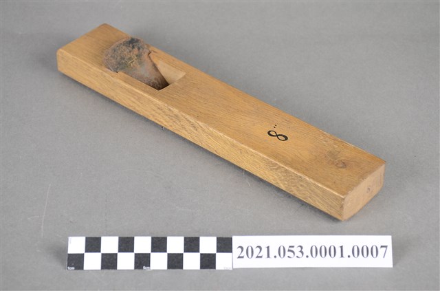 本件木型鉋,刀刃規格1寸2,為製作木模模具專用鉋刀,採一枚刃、低角度、入嵌拉式做法。刀刃的刀頭上刻有「森本 登錄 佐」等字樣,可能為工具店名或鉋刃店名。 刀刃口寬度約為3.7公分(37mm),約為1(台)寸2分,鉋台底部採外圓做法,鉋身上方寫有「8"」黑字,可能為尺寸或工具編號標示,鉋尾刻有「たいたつ」字樣及蓋印「8」黑字。本鉋刀使用於高雄地區,據捐贈者訪談,使用者為林春榮(澎湖人,約1919、1920年生)先生的哥哥,任職於高雄的機械公司,從事木作模型的製作。