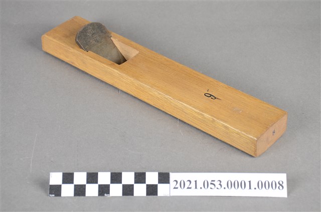 本件木型鉋,刀刃規格1寸2,為製作木模模具專用鉋刀,採一枚刃、低角度、入嵌拉式做法。刀刃的刀頭上刻有「森本 登錄 佐」等字樣,可能為工具店名或鉋刃店名。 刀刃口寬度約為3.7公分(37mm),約為1(台)寸2分,鉋台底部採外圓做法,鉋身上方寫有「9"」黑字,可能為尺寸或工具編號標示,鉋尾刻有「たいたつ」字樣及蓋印「8」黑字。本鉋刀使用於高雄地區,據捐贈者訪談,使用者為林春榮(澎湖人,約1919、1920年生)先生的哥哥,任職於高雄的機械公司,從事木作模型的製作。