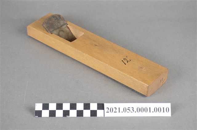 本件木型鉋,刀刃規格1寸4,為製作木模模具專用鉋刀,採一枚刃、低角度、入嵌拉式做法。刀刃的刀頭上刻有「森本 登錄 佐」等字樣,可能為工具店名或鉋刃店名。 刀刃口寬度約為4.2公分(42mm),約為1(台)寸4分,鉋台底部採外圓做法,鉋身上方寫有「12"」黑字,可能為尺寸或工具編號標示,鉋尾刻有「たいたつ」字樣及蓋印「12」黑字。本鉋刀使用於高雄地區,據捐贈者訪談,使用者為林春榮(澎湖人,約1919、1920年生)先生的哥哥,任職於高雄的機械公司,從事木作模型的製作。
