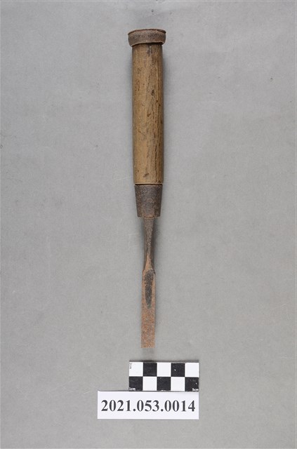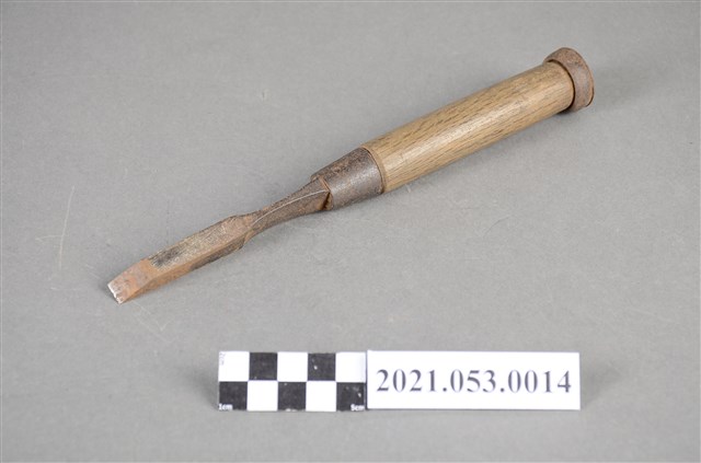 本件斜口鑿刀,為木工工具,由刀片、木柄、鐵環等構件組成。刀柄扁平,屬修鑿(又稱平侍),用於修平、鑿修榫孔底部或傾斜的孔。刀刃口寬度約0.9公分(9mm),為3分鑿。