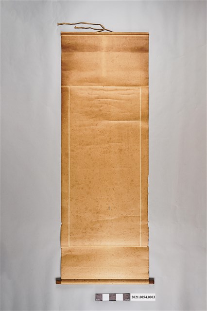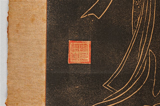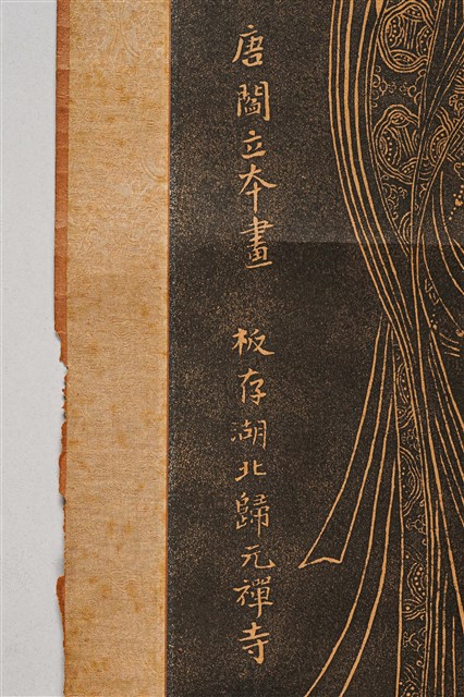 本件捲軸為板印拓製的佛像畫,唐閻立本繪「觀音大士聖像」,板存湖北歸元禪寺。捐贈人於民國60、70年代由臺北師大附近的裝裱店購藏所得,應是輾轉由香港流通至臺灣的佛教文物。
