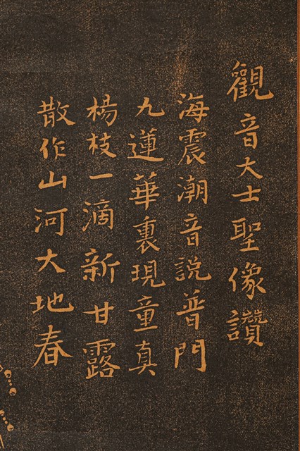 唐畫家閻立本所繪楊枝觀音像,唐代仕女形象的觀世音菩薩,右手執楊枝,左手托凈瓶,珠冠錦袍、珠冠錦袍,瓔珞飄披,袒胸跣足,瑞相壯麗。線條流暢自然,造型優美動人。這件湖北歸元禪寺版本的觀音大士聖像,右上角鐫觀音大士聖像讚「海震潮音說普門,九蓮華裏現童真,楊枝一滴新甘露,散作山河大地春。」歸元禪寺位於湖北漢陽,於順治15(1658)年由來自浙江的白光、主峰兩位法師創建。這幅觀音大士聖像傳布當是淵源於浙江普陀山的楊枝觀音聖像。