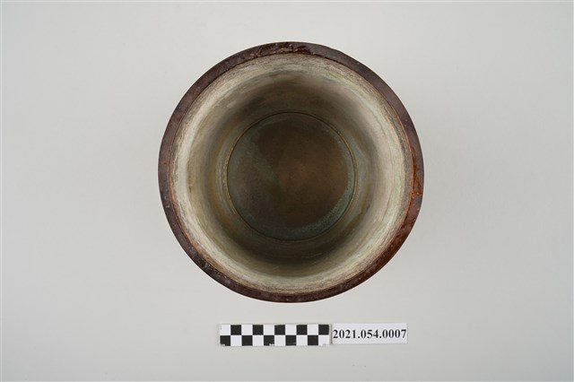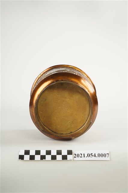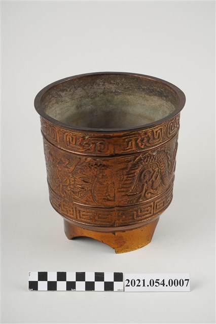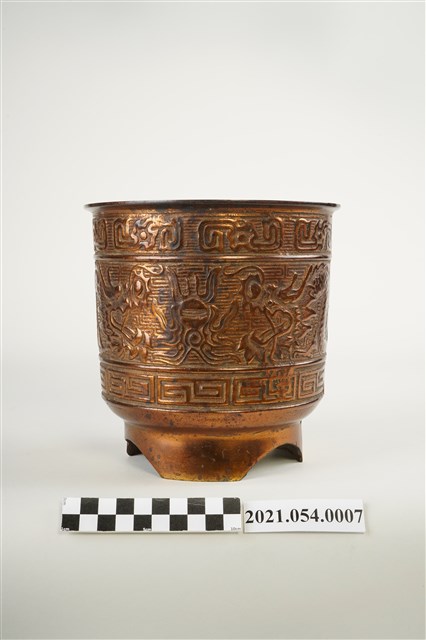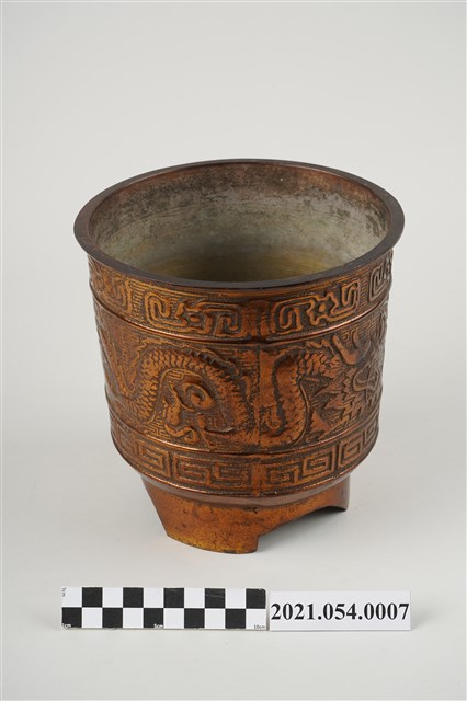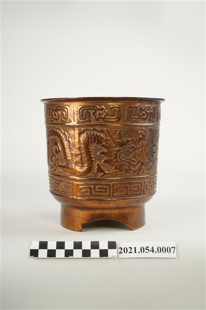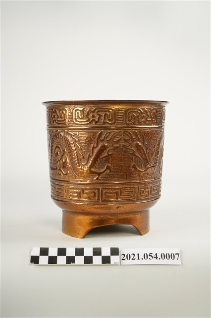 神明爐為祭祀神明用香爐之總稱,一般以供插線香的香爐為主,普遍見於寺廟祀神和民居廳堂祀神。臺灣所見神明爐多安置於供桌上使用,爐身高約六寸到二尺不等,是最主要的祭祀用具,其造型和材質十分多元。在造型上,方形爐多為敞口,圓形爐則可區分為爐身直筒如米斗的斗爐,爐口外翻的披爐與爐口內縮的詌爐三種類型,又有三足、四足、圈足等差異。本件銅鑄神明爐爐身直筒狀,爐身裝飾雙龍搶珠浮雕上下圈飾回紋圖案,爐底亦槧刻類似「雙龍」字跡,圈足部分則切開三個半圓變成三足造型。