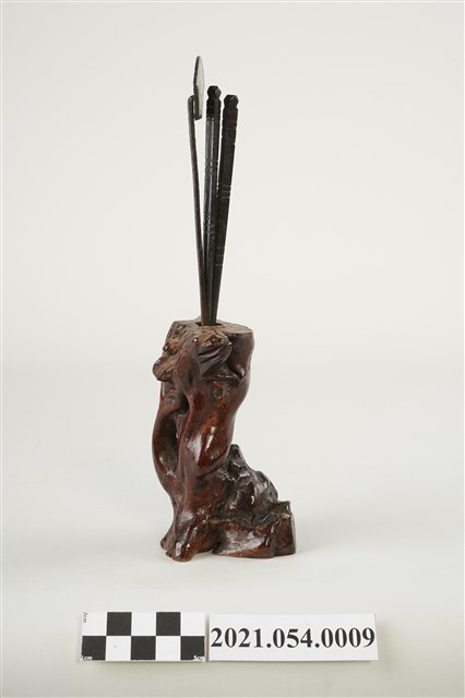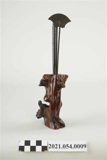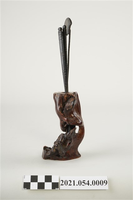 香灰整理器具一組,包括九芎木質樹瘤雕刻的基座,一柄鐵製香灰剷、一付鐵製火炭筷。