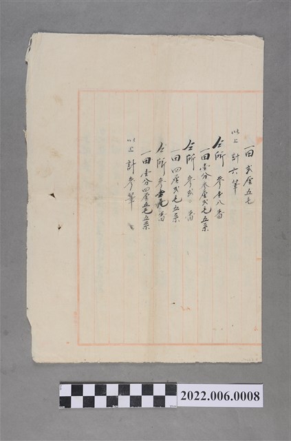 本物件為1式2份的「土地表示單」,是土地買賣或轉讓時契約書的一部分。內容標的物為臺北廳八里坌堡坑仔外土名草仔崎297、299、300、301、305、306、318、319、320番地。由「臺北廳」地名來判斷,「臺北廳」初設於明治34年(1901)11月,至大正9年(1920)9月,與宜蘭廳及桃園廳的三角湧合併為臺北州,「臺北廳」廢廳。因此,推估本份資料介於明治34年(1901)至大正9年(1920)9月之間。