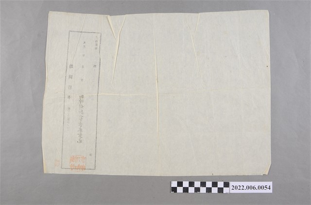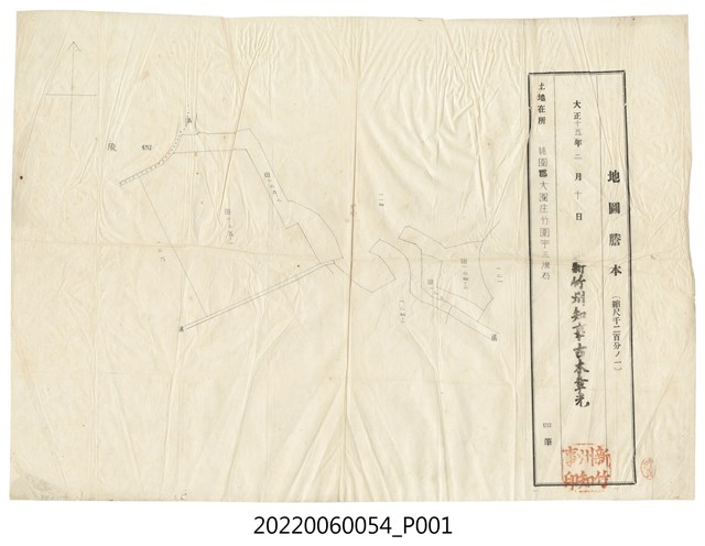 本物件為一份「地圖謄本(縮尺千二百分ノ一)」,為大正15年(1926)2月10日調查土地所在桃園郡大園庄竹圍字四股的「一二五ノ一番地」、「一二五ノ二番地」、「一二三番地」、「一二四ノ二番地」,皆為田地;本份地圖謄本署名為新竹州知事古木章光。
