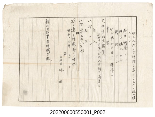 本物件共有3份資料,包括「起業方法書」、「官有原野豫約賣渡願」及「實測設計圖(縮尺千三百分一)」,標的物為新竹州桃園郡蘆竹庄坑子外草仔崎356-3、359番地,願人為林田。本份資料由林田填寫申請,向新竹州廳申請開墾草仔崎356-3、359番地,開墾內容包括道路開鑿、用惡水路、土壘築造、家屋建築、耕牛飼養(含購入)與耕作,總經費為498円,申請時間為昭和13年(1938)。