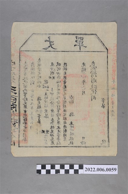 本文物為一張「丈單」,時間為光緒14年(1888)6月;內容大意說明光緒14年(1888)清查丈量業主林柏祿坐落於坑仔外社庄下中則田園1甲9分2厘5毫8絲。其四至並賦,則由縣編造圖冊外合行摯給丈單永遠管業,嗣後倘有典賣應將丈單隨契流交推收過割須單。右給業主林伯祿收執。本丈單由臺灣布政使司發給,左下角發行字號處蓋有一紅印張,因過於模糊而無法辨識。