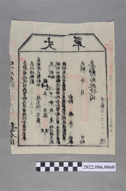 本文物為一張「丈單」,時間為光緒14年(1888)7月;內容大意說明光緒14年(1888)清查丈量業主林水坐落於桃澗堡芝葩里庄下田1甲2分1厘7毫2絲、園2甲9分3厘7毫6絲、埔5甲6分4厘2毫4絲。由縣編造圖冊外合行摯給丈單永遠管業,嗣後倘有典賣應將丈單隨契流交推收過割須單。右給淡水縣業主林水收執。本丈單由臺灣布政使司發給,發行字號為字第參千陸百伍十伍號。