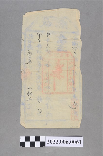 本文物為一張「執照」,時間為光緒20年(1894)6月;內容大意說明收過瓦厝後庄小租林賜天,完納甲午年口糧栗實收六成。業主處蓋有一紅印章︰縣正堂翁、給坑仔社頭目何繼昌之戳記;紙張左下角還蓋有一紅印章︰坑仔社課館記。因此可知,本張「執照」為光緒20年(1894)6月業主坑仔社頭目何繼昌發給納戶林賜天之納戶執照,證明已完納光緒20年(1894)口糧栗陸斗正升(6斗5升);林賜天為林氏族親。