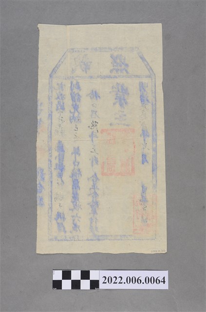 本文物為一張「執照」,時間為明治32年(1899)7月;內容大意說明收過下社瓦厝後庄小租林賜天,挑運到館完納已亥年口糧栗實收六成。業主處蓋有一紅印章︰坑仔社頭目何繼昌之戳記;紙張左下角還蓋有一紅印章︰坑仔社課館記。因此可知,本張「執照」為明治32年(1899)7月業主坑仔社頭目何繼昌發給納戶林賜天之納戶執照,證明已完納明治32年(1899)口糧栗陸斗正升(6斗5升);林賜天為林氏族親。