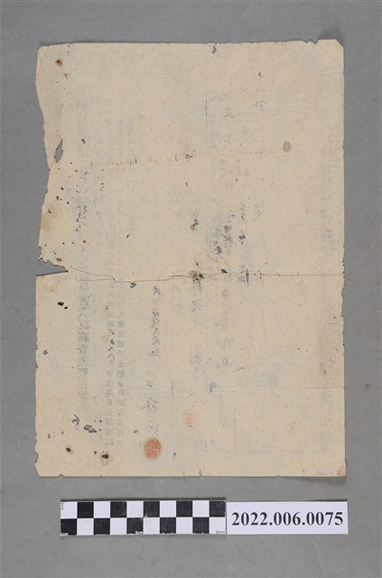 本物件為一份「新竹縣桃園區蘆竹鄉外社村保土地收益旱害狀況調查表暨保證書」,主要是由村里長林元生、林宗令進行調查,林田進行申請,鄉鎮長劉新丁為保證人,於民國35年(1946)調查台灣省新竹縣政府保得業戶「臺灣拓殖會社」出租之坑仔外359-2番地、359-3番地,因播收無成之災害,申請免徵第二期賦課稅收。