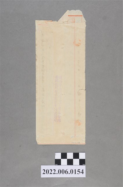本物件為一信封袋,正面手寫「林田殿」、「桃園郡蘆竹庄坑子外字草仔崎三三八」的字樣及寫有「新竹郵便別納料金」的圓形郵戳;背面蓋有「新竹市東門町壹町目五番地」、「臺灣拓殖株式會社新竹出張所」的字樣。本信件是由一封公文摺疊黏貼而成,公文的日期標註5月30日土曜日(星期六),經查日治時期5月30日適逢星期六年度共計有7年(1903、1908、1914、1925、1931、1936、1942),再依據臺拓成立於昭和11年(1936)的時間來看,估計本信封袋使用的時間在昭和11年(1936)與昭和17年(1942)的5月30日之後。經過整理,發現本批文物中,有二張與「臺灣拓殖株式會社」有關的信件-「昭和17年(1942)12月18日保證金利息計算通知書」與「昭和20年(1945)6月20日社有地貸付料變更通知書」,收件人都是林田。所以,推估本信封袋最早是昭和11年(1936) 5月30日寫成公文,在昭和17年(1942)12月18日摺疊成信封袋寄送「保證金利息計算通知書」給林田;最晚則是昭和17年(1942)的5月30日寫成公文,在昭和20年(1945)6月20日摺疊成信封袋寄送「社有地貸付料變更通知書」給林田。因此本信件袋形成時間,介於昭和11年(1936) 5月30日至昭和20年(1945)6月20日之間,林田時年58-67歲。